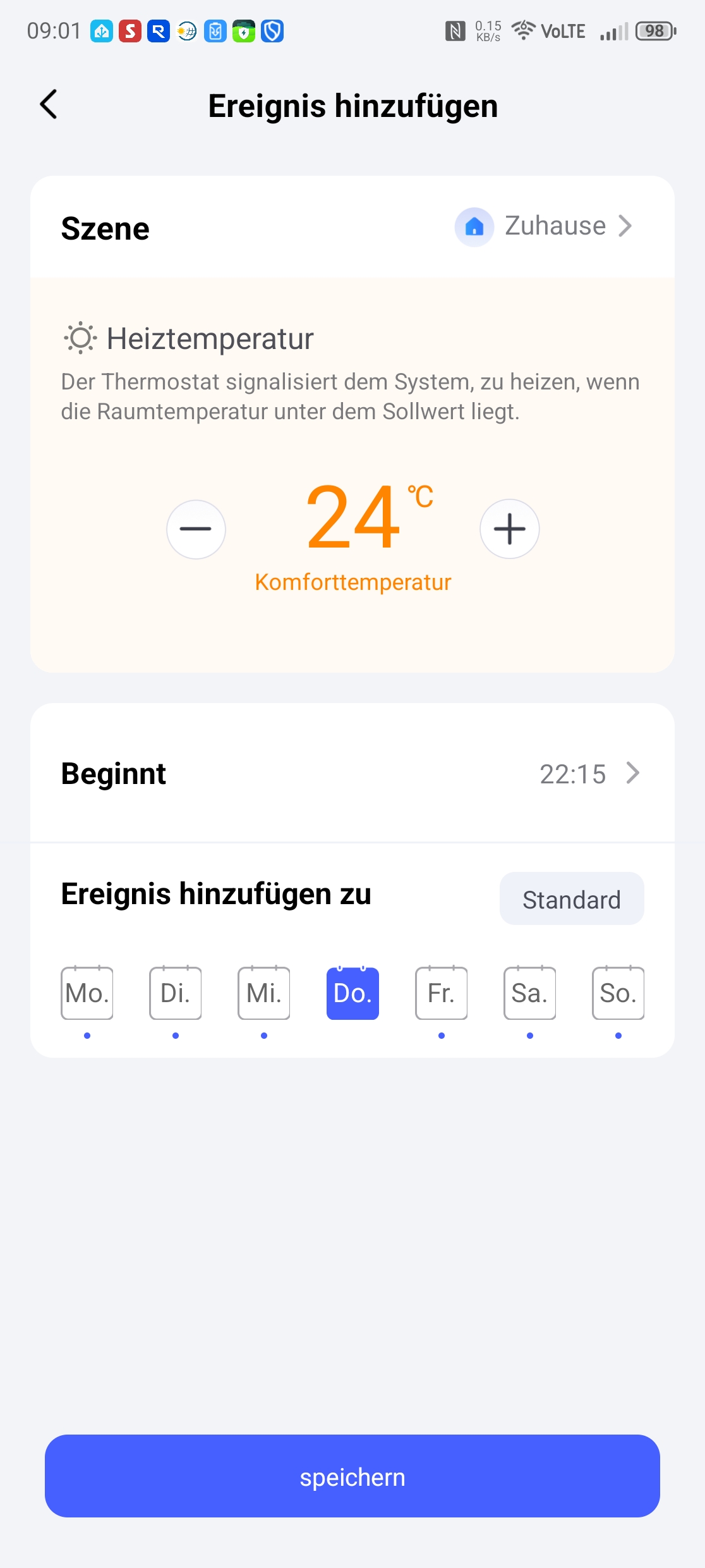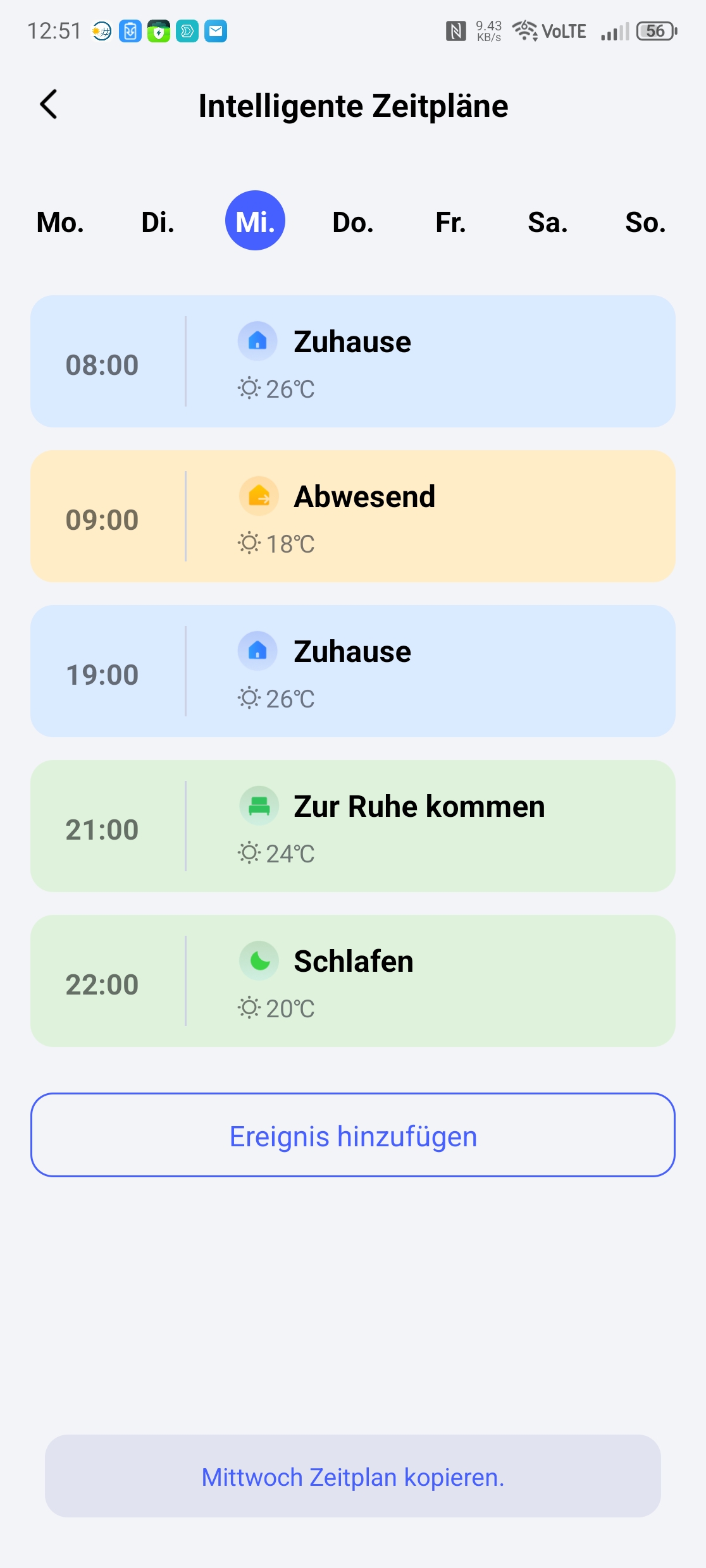 Das Thermostat unterstützt auch eine manuelle Ventilkalibrierung. Eine automatisierte, zeitgesteuerte Kalibrierung ist in der App jedoch nicht vorgesehen. Ein praktischer Workaround besteht darin, das Thermostat etwa monatlich manuell einzuschalten, die Temperatur zunächst auf die maximalen 30 °C und anschließend auf 5 °C zu stellen und es danach wieder auszuschalten. Dieser Vorgang schützt das Ventil in den Sommermonaten zuverlässig vor Verkalkung.