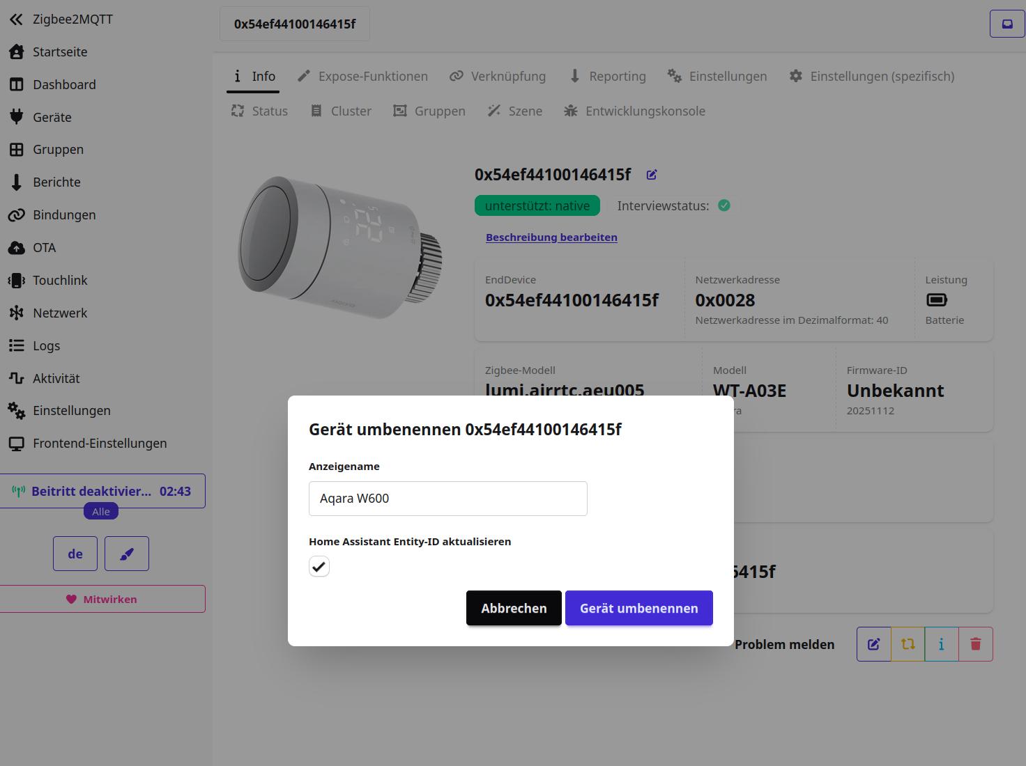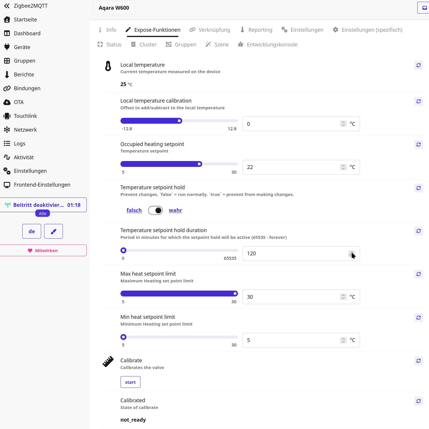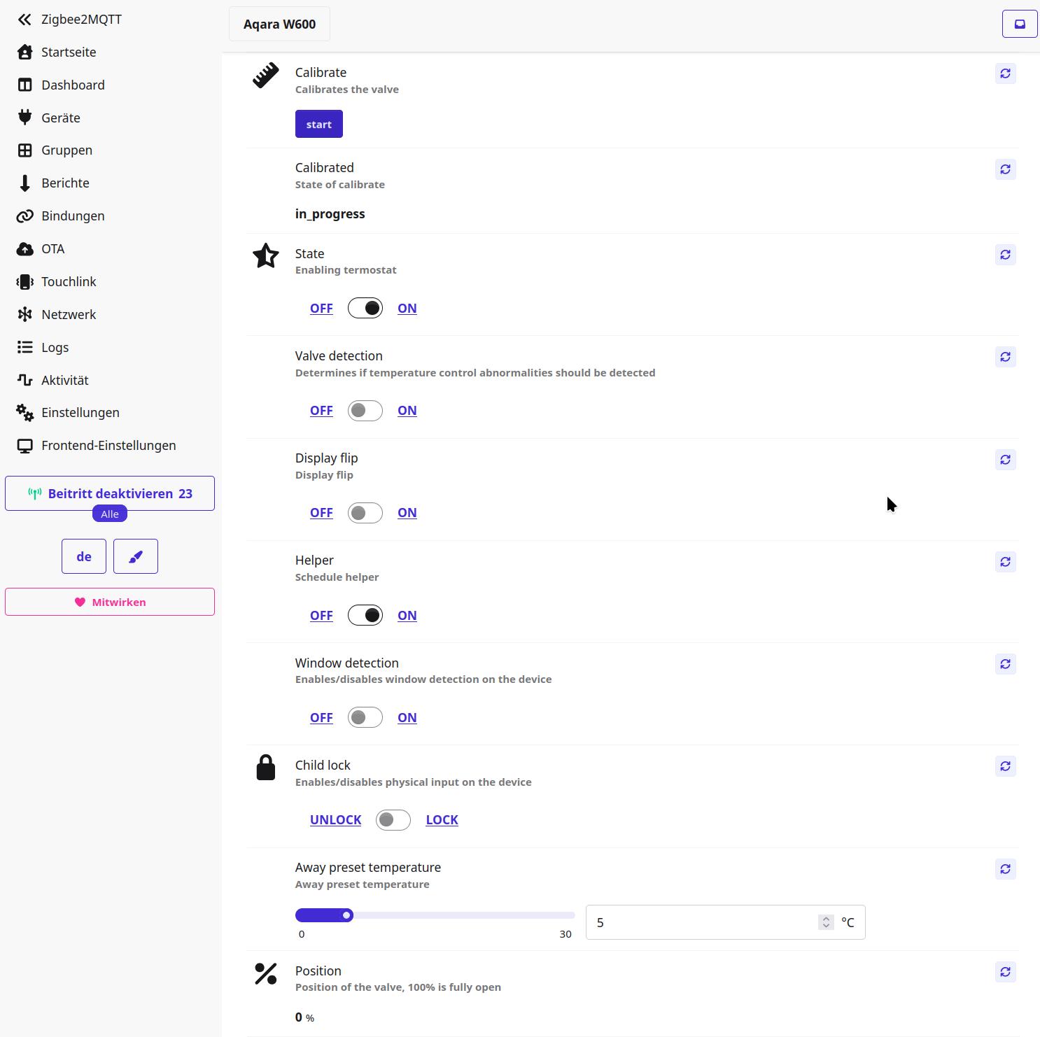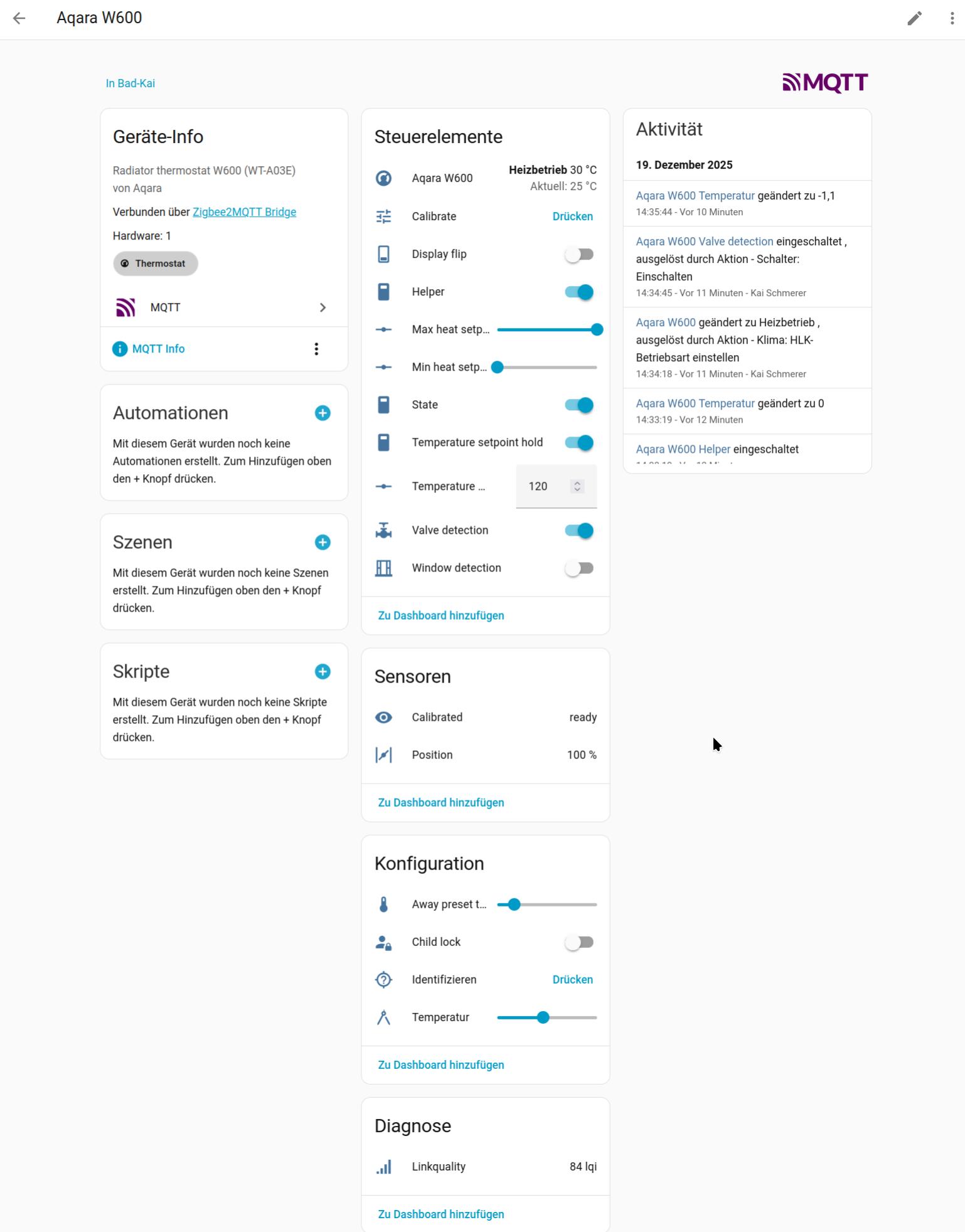 Die Integration des Aqara W600 in Home Assistant via Zigbee2MQTT bietet einen erweiterten Funktionsumfang gegenüber der Aqara-App. Ein deutlicher Mehrwert ist die Möglichkeit, die aktuelle Ventilposition abzurufen.