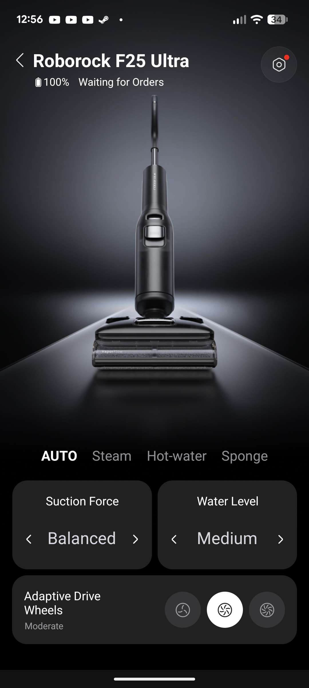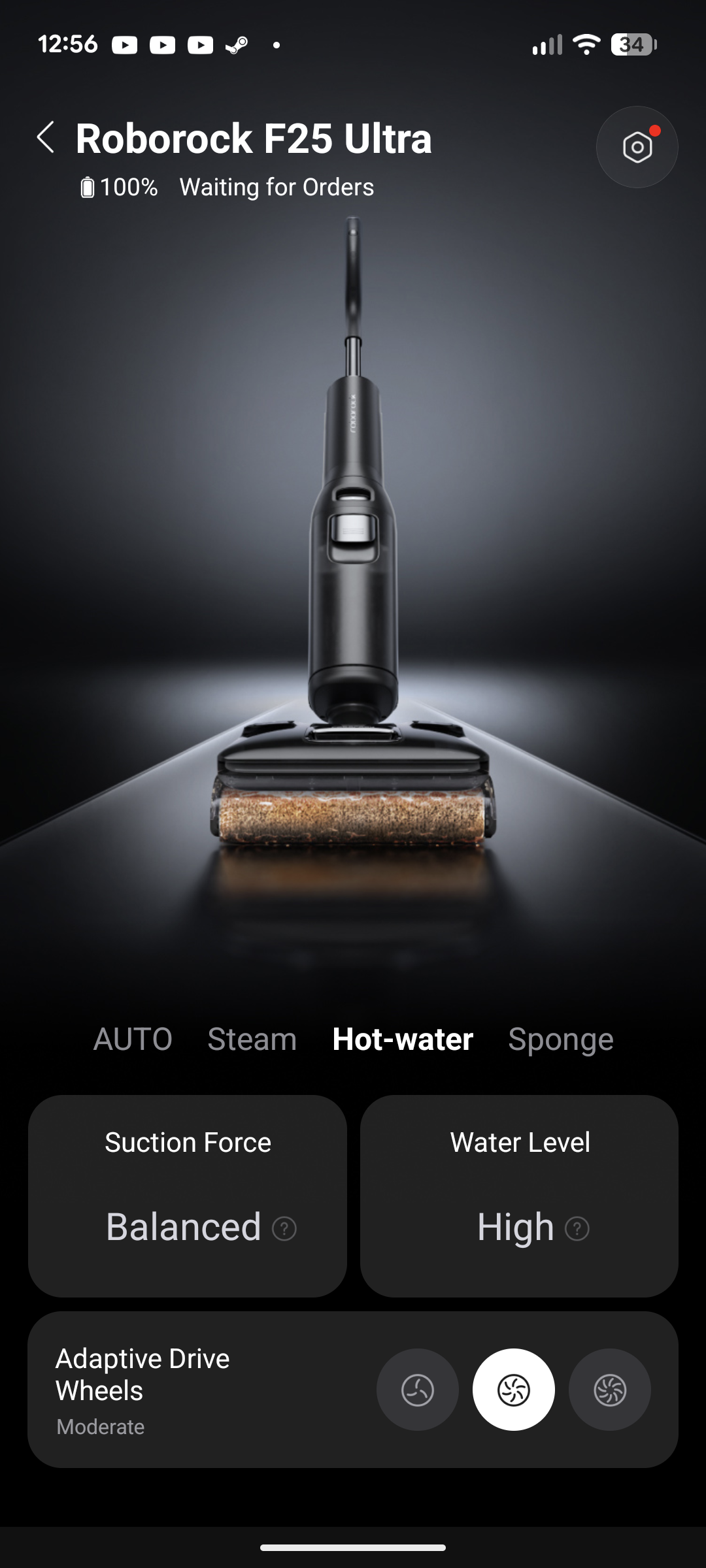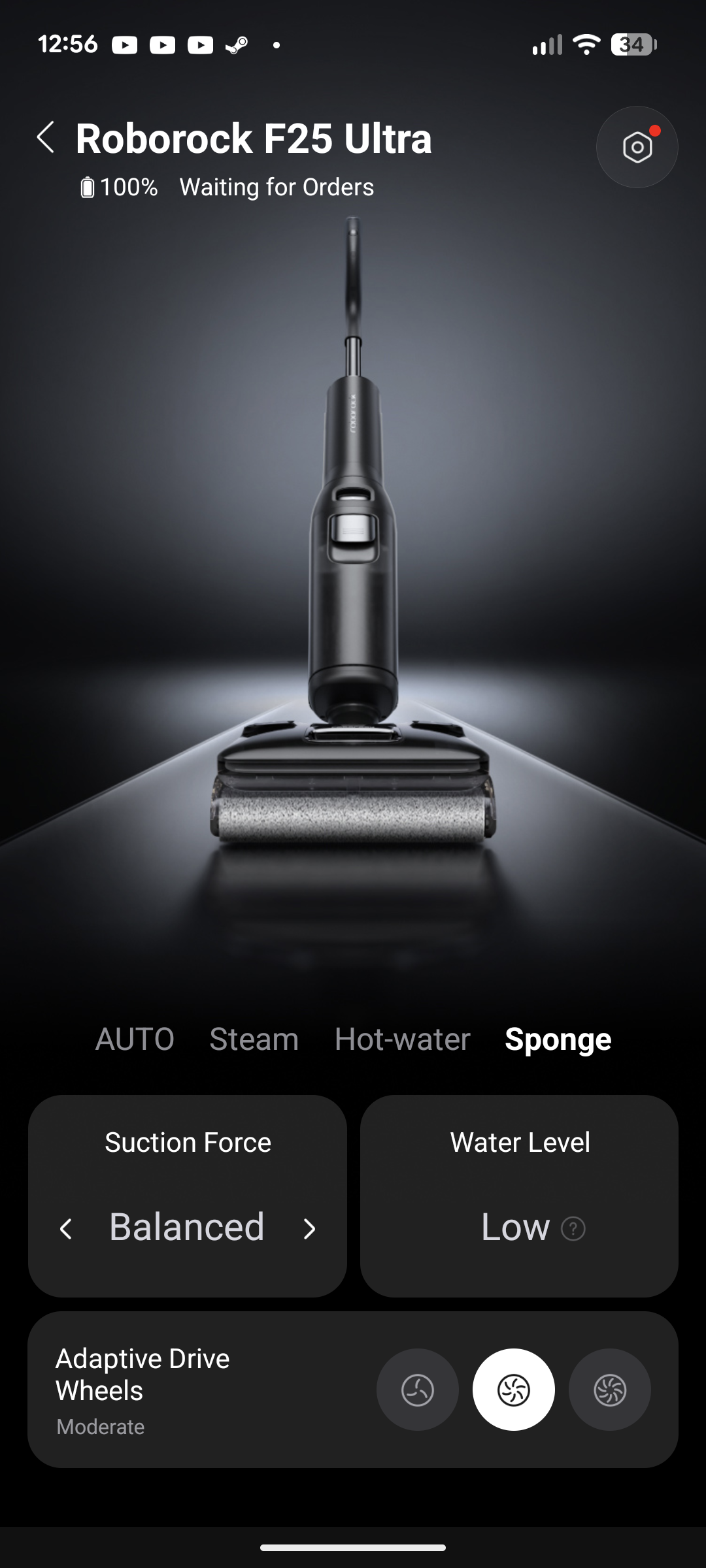 Die Verbindung zwischen Smartphone und Roborock Dyad Pro gelingt mit der Roborock-App fast von allein. Nach der Kopplung stehen dem Nutzer Schnellzugriffe für ausgeglichene und intensive Selbstreinigung sowie leises und lautes Trocknen zur Verfügung. Zentral zeigt die App zudem eine grafische Darstellung des Wischsaugers sowie den Ladezustand des Akkus. Zusätzlich gibt es weitere Einstellungsmöglichkeiten. Normalerweise läuft das Gerät im Automatikmodus, der Saugkraft und Wasserzufuhr selbständig regelt. Der Nutzer darf darauf allerdings auch manuell zugreifen, zudem hat er Einfluss auf die Rollendrehgeschwindigkeit.