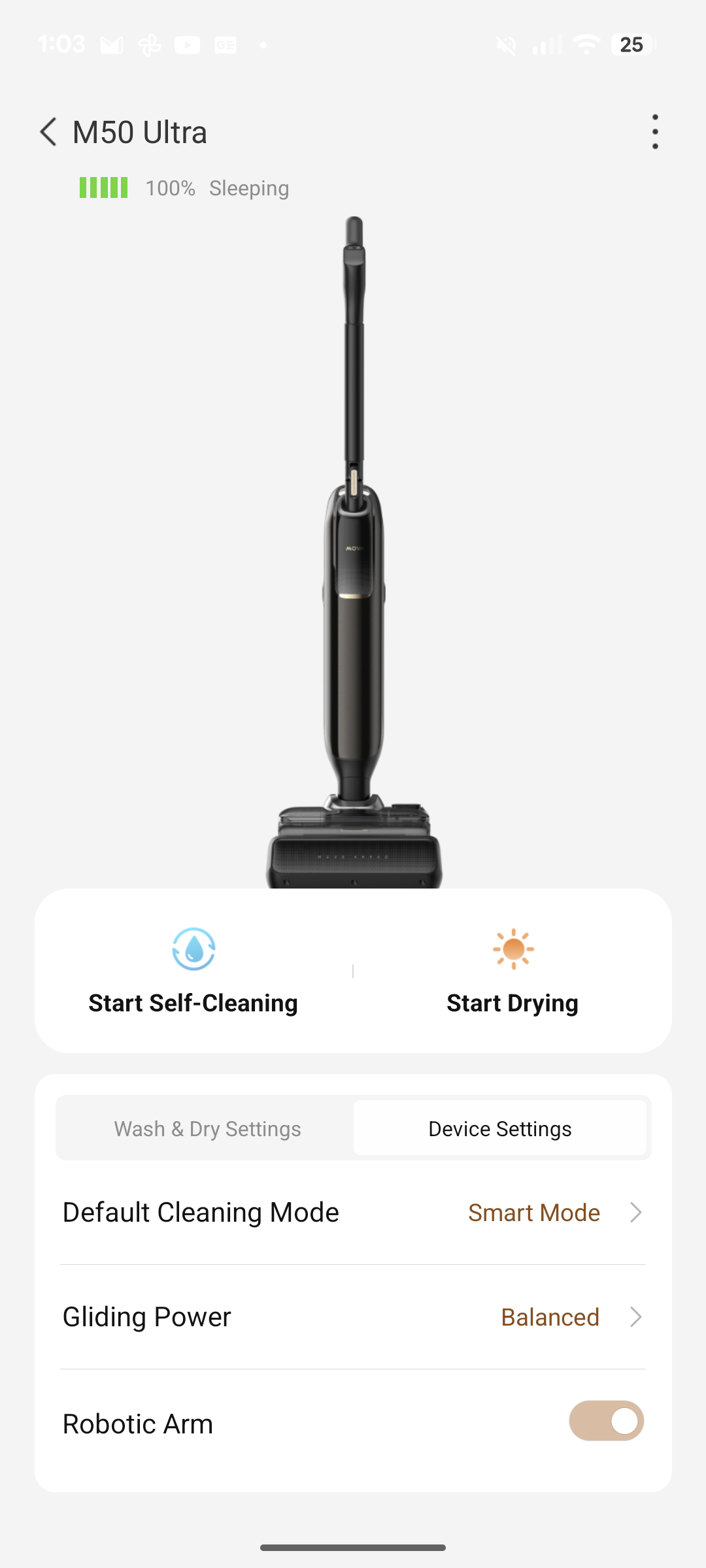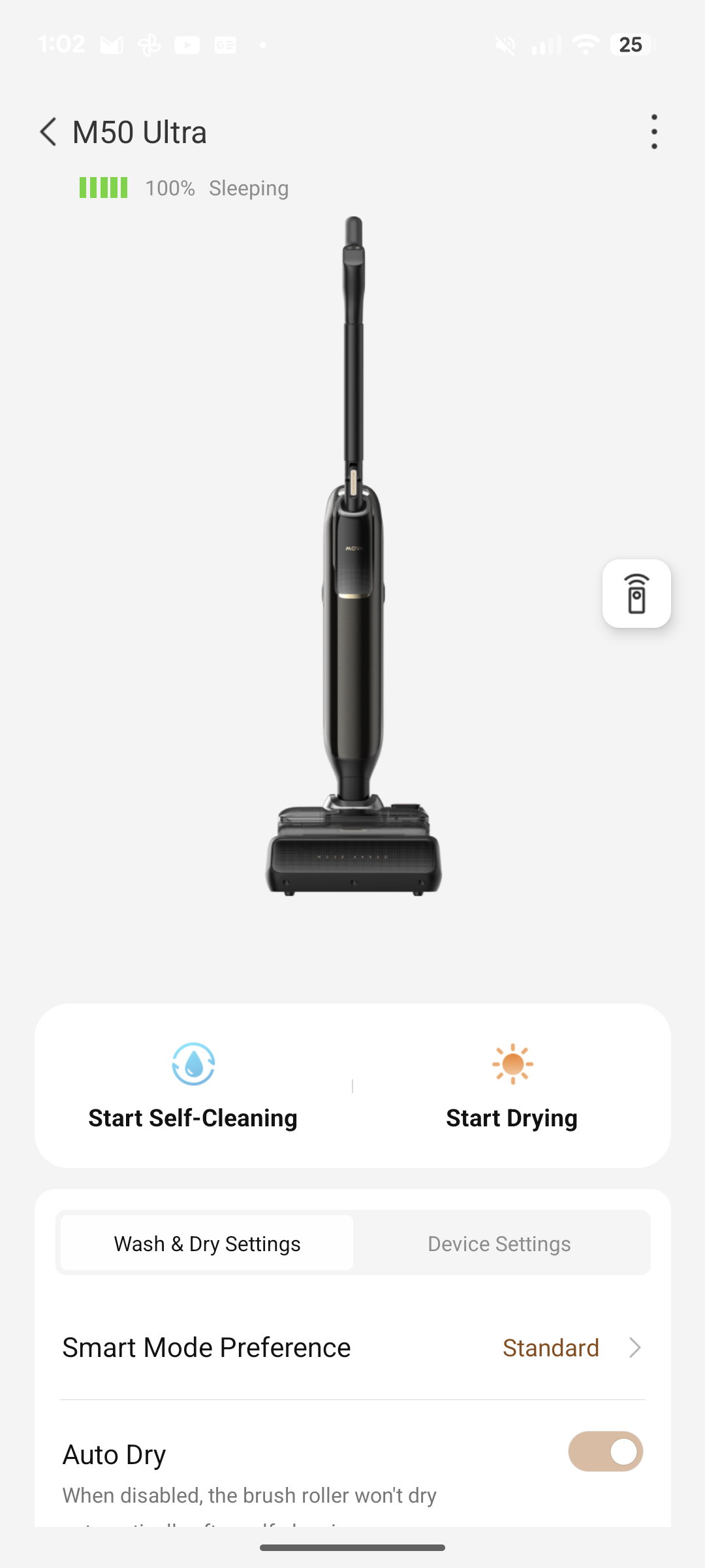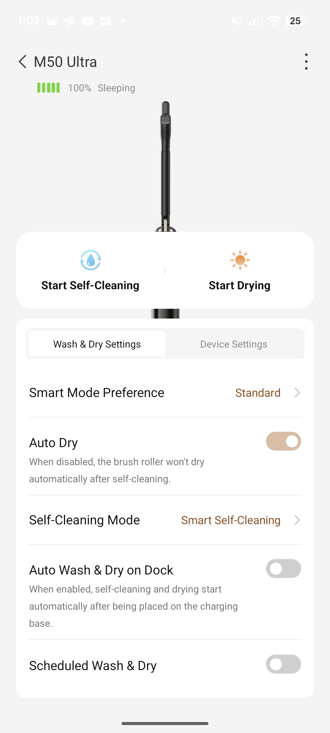 Endlich implementiert ein Hersteller zudem die Möglichkeit zur Selbstbestimmung, ob der Saugwischer nach jedem Gebrauch beim Zurückstellen die Selbstreinigung startet. Gerade, wenn man lediglich „mal eben“ einen Wasserfleck weggewischt hat, benötigt man keine Vollreinigung des Gerätes. Zudem erlaubt die App die Festlegung, ob der Dyad Pro beim Abknicken nach dem Aufstellen des Gerätes automatisch und ohne zusätzlichen Knopfdruck wieder die Arbeit aufnehmen soll.