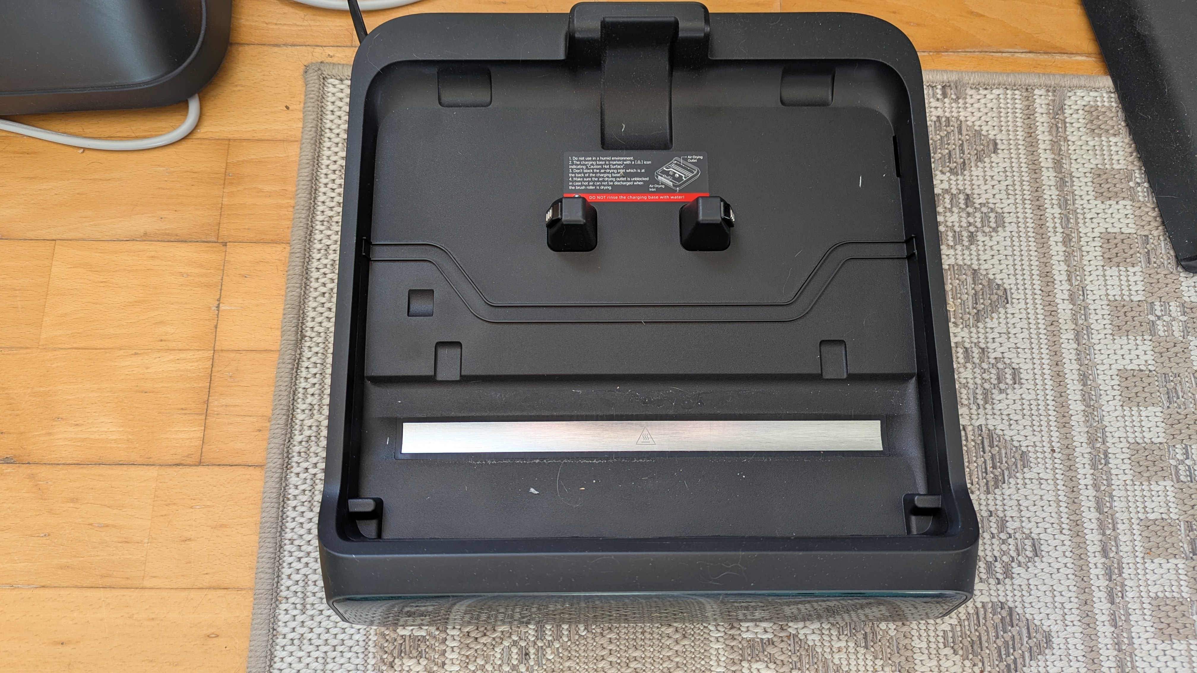 Auch die Dockingstation ist schwarz. Leider hat sie keine Auffahrrampe, was bedeutet, dass man den gut 5,6 kg schweren Saugwischer jedes Mal anheben muss, um ihn in die Station zu stellen oder herauszunehmen. Gerade körperlich eingeschränkte Menschen könnten damit zu kämpfen haben.